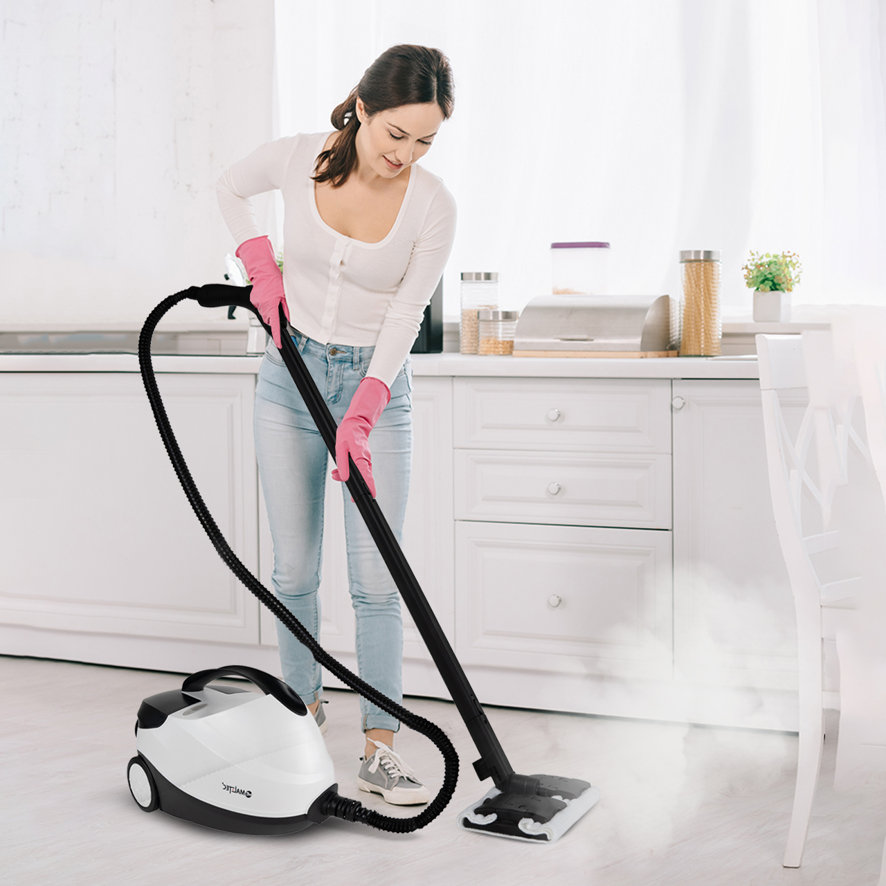 Radzi sobie z czyszczeniem podłóg, fug, płytek, armatury, okien, tapicerki, sprzętów kuchennych, wanien, toalet, rusztów czy nawet usuwaniem tapet.