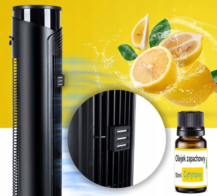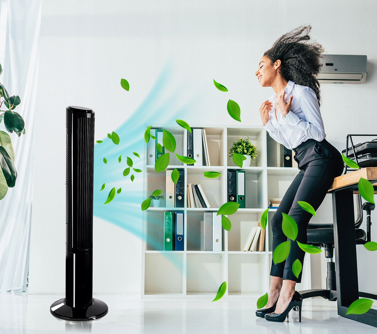 To nie jest zwykły wiatrak stojący. To dopracowany wentylator wieżowy z turbinowym systemem nadmuchu, który pracuje na całej swojej wysokości.