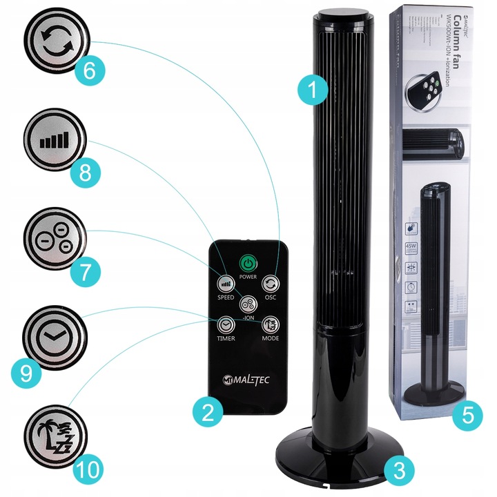 WENTYLATOR KOLUMNOWY PIONOWY WIATRAK PODŁOGOWY JONIZACJA CICHY MOCNY Maltec WK500Wt-ION wyposażono w moduł jonizujący, który aktywnie wpływa na mikroklimat pomieszczenia.