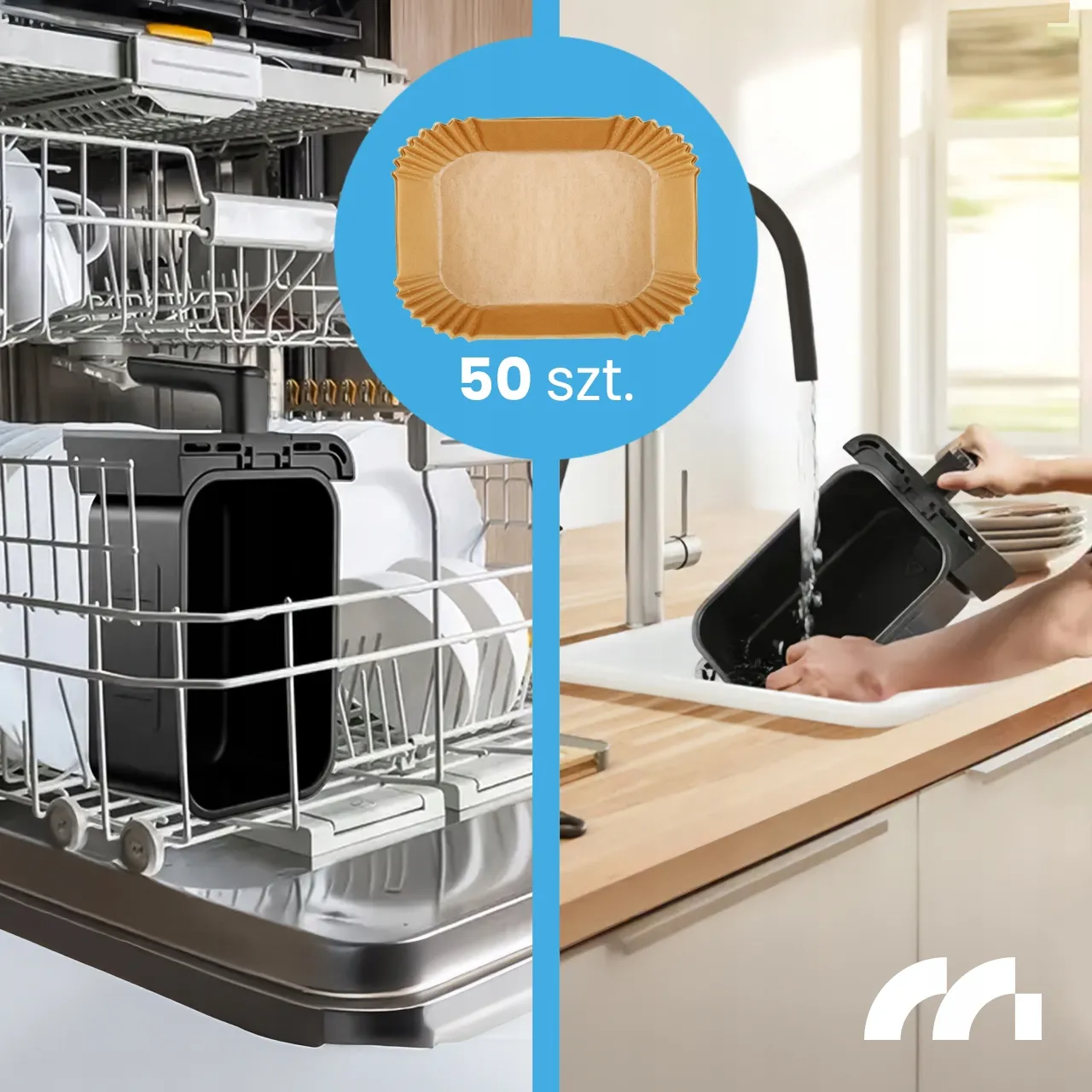 Dodatkowo w zestawie otrzymujesz 50 jednorazowych tacek do pieczenia, które znacząco ograniczają zabrudzenia koszy. To praktyczny dodatek, który oszczędza czas po każdym gotowaniu.
